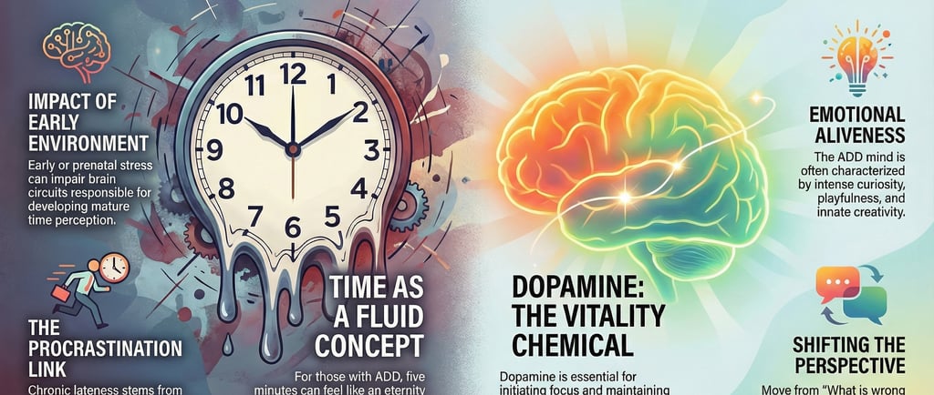 When we view chronic lateness as a coping mechanism shaped by early life experiences rather than a character flaw, we open the door to real change. Interestingly, the same "emotional aliveness" and curiosity that lead to ADD struggles are also the hallmarks of creativity and playfulness. Many successful creative professionals and comedians share these exact traits.
